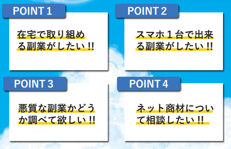 一緒に副業に関する問題を解決できる様、一人一人に寄り添ったアドバイスをさせて頂きます。